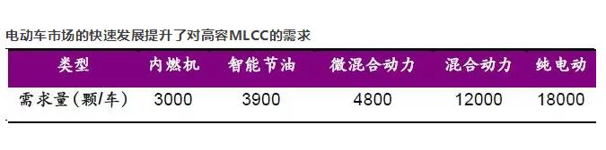 通信頻段大幅增加將帶來超小型MLCC的需求增量。相比目前滿足LTE標(biāo)準(zhǔn)的手機需要的300-500 顆貼片電容 ,到滿足LTE-advanced標(biāo)準(zhǔn)的手機需550-900顆,單機MLCC用量將提升80%以上。電動車市場的快速發(fā)展提升了對高容MLCC的需求。燃油車不需要使用MLCC,而純電動車需要使用大約18000個高容MLCC。